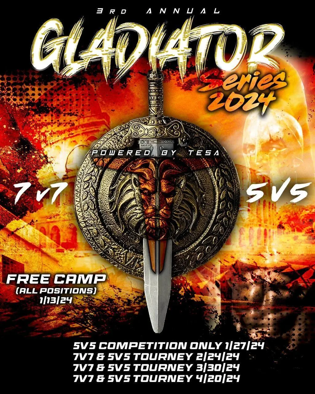 Gladiator, every year has been a huge success, and we expect better for 2024. We will be doing a FREE all positions camp, along with a (4) 5v5 and (3) 7v7 tournaments this year. At all 3 tournaments we will be hosting 5v5 and 7v7 for youth and High School! Every Tournament is considered its own per date! You are not required to do all tournaments. You can definitely commit to just 1. Thank You for your interest in The Gladiator Series!